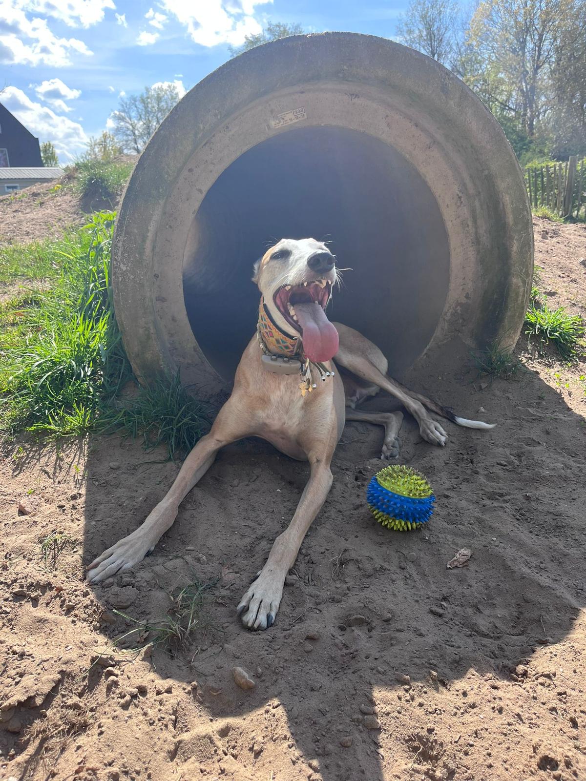 Hij kan probleemloos mee in de auto én in de bus, wat hem een ideale metgezel maakt voor uitstapjes. Spelen doet hij ook graag, vooral met een bal met piep. Na het spelen paradeert hij trots met zijn bal in zijn bek.