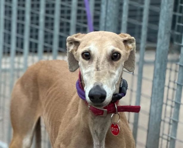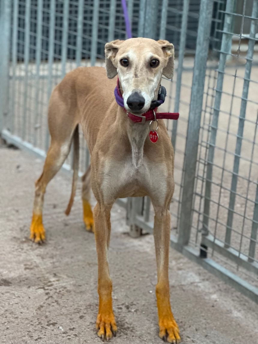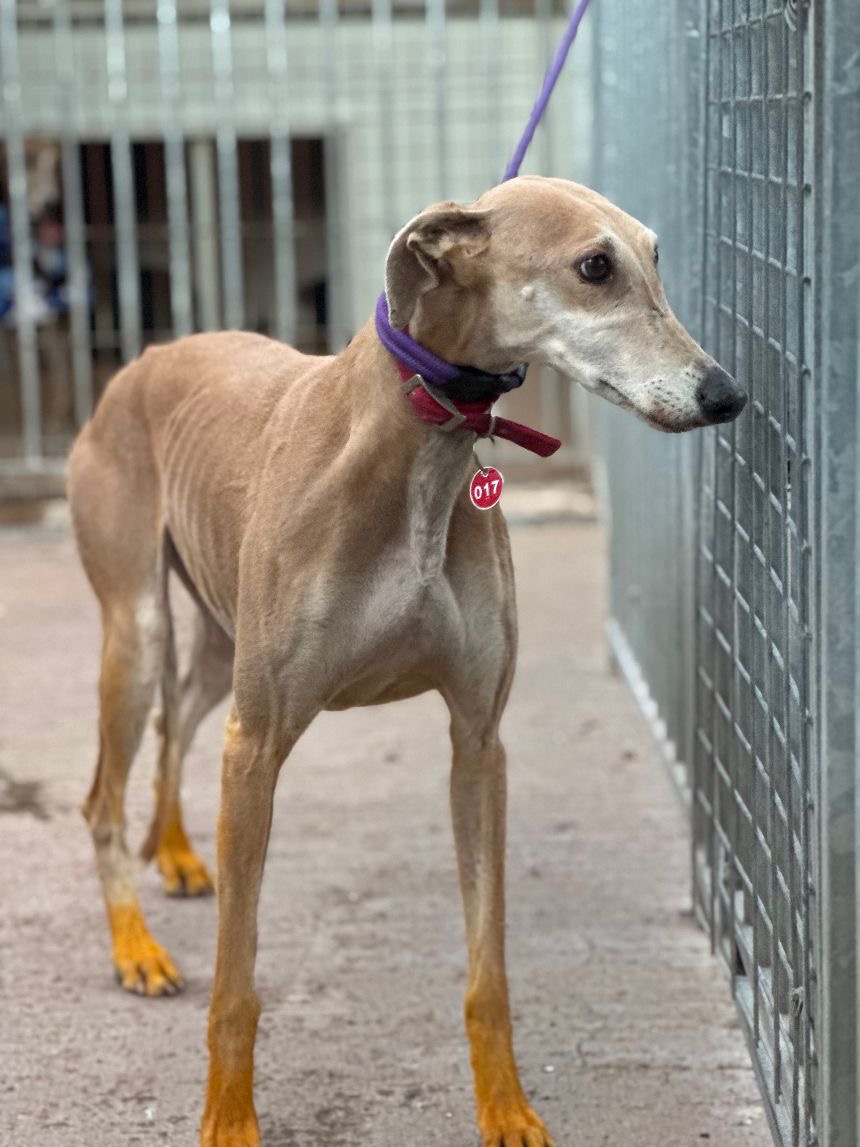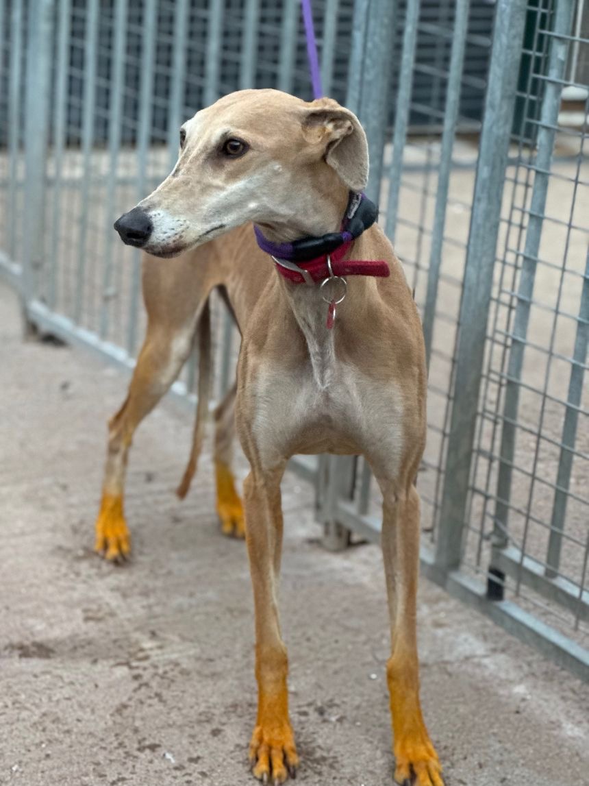 Deze schoonheid is Kira, een galgo dame van bijna 6 jaar oud. Ze is samen met Lía afgestaan door hun jager en heeft, net als Lía, gele vloeistof op haar poten, iets wat sommige jagers gebruiken, zodat ze minder snel gewond raken tijdens de jacht.