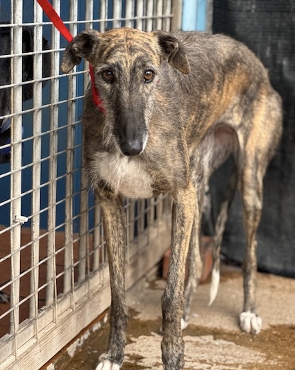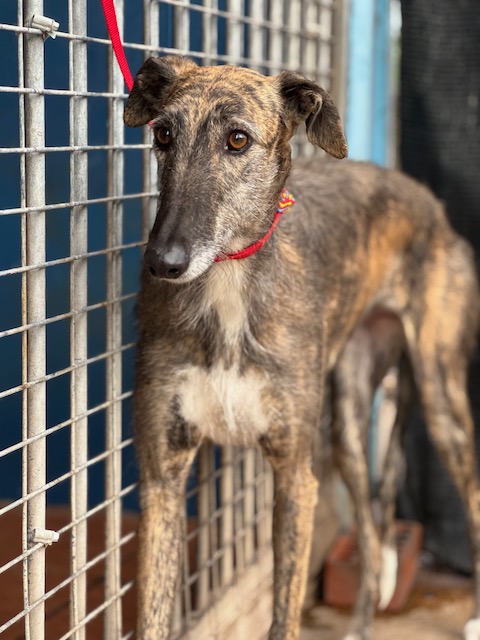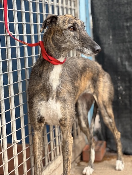 Dit prachtige ruwharige galgo-meisje van 4 jaar oud is afgestaan door haar jager, en je ziet het aan alles: haar ogen zoeken nog houvast, haar houding is voorzichtig, alsof de wereld ineens te groot en te luid is geworden. De verhuizing heeft indruk gemaakt. Ze begrijpt nog niet waarom haar leven zo plots veranderde.