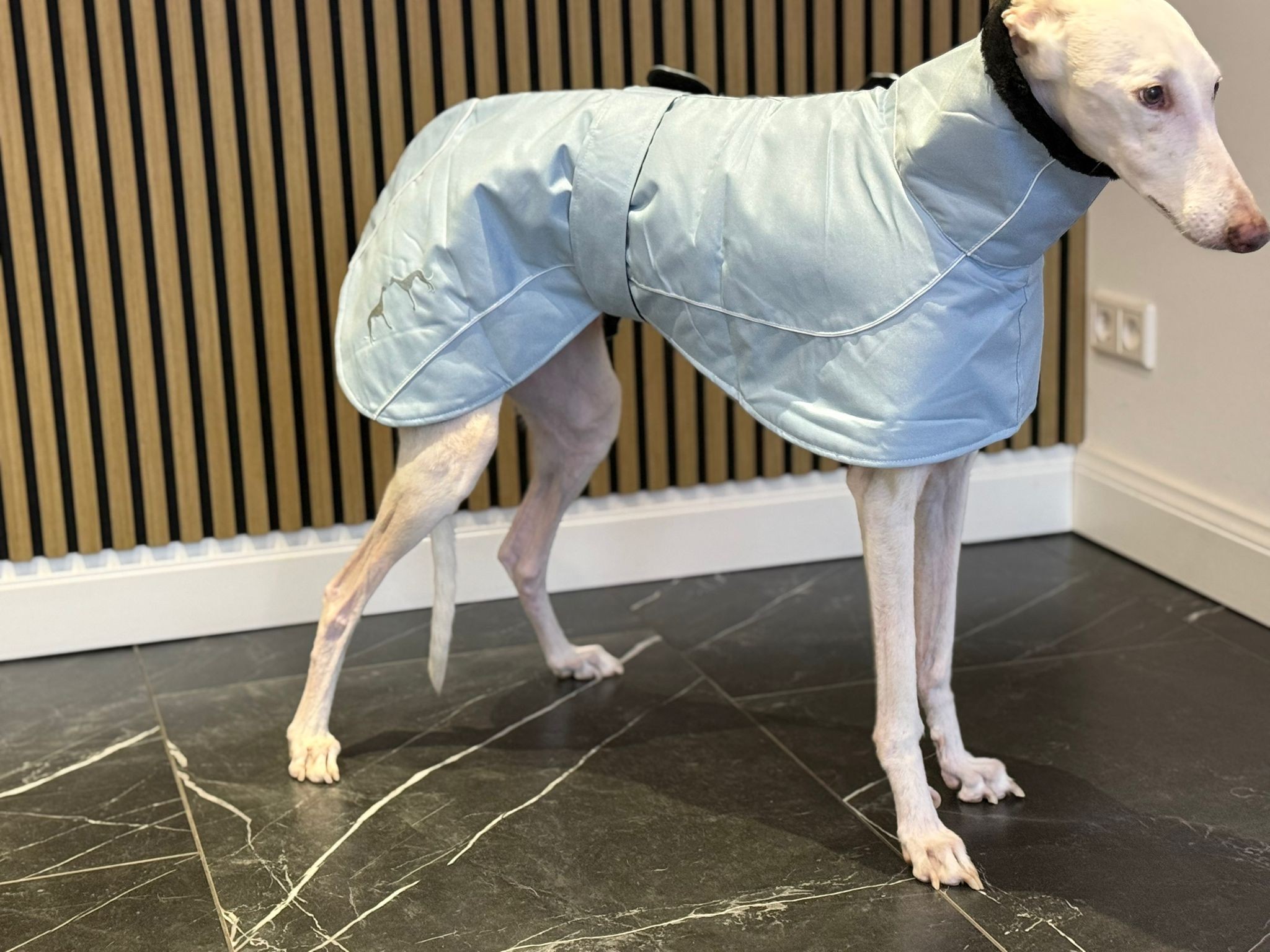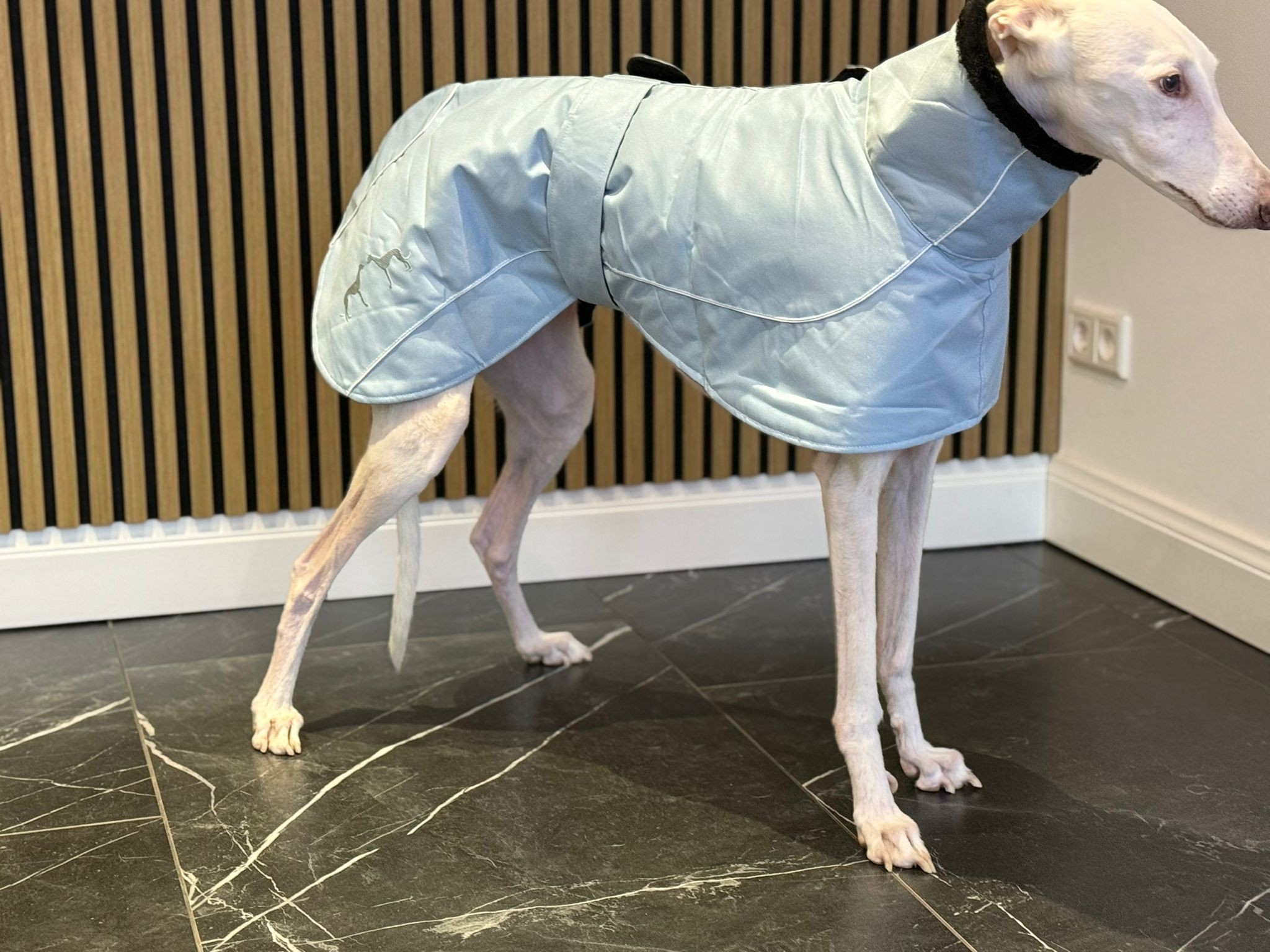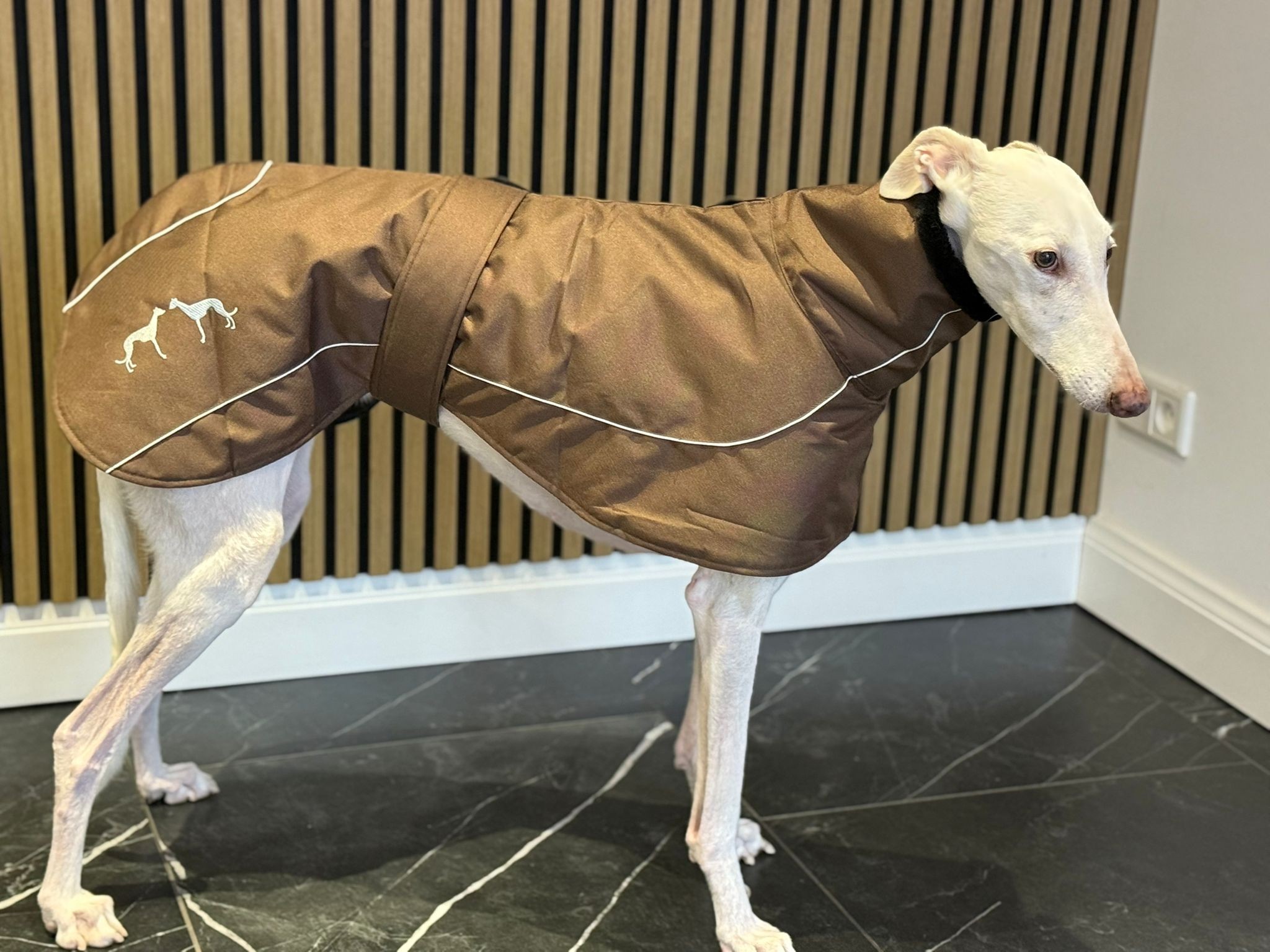 De jas is winddicht en lekker warm. De jas gaat over het hoofd aan en sluit met klittenband middels een band om de buik. Verkrijgbaar in de meest gangbare Galgo-maten.