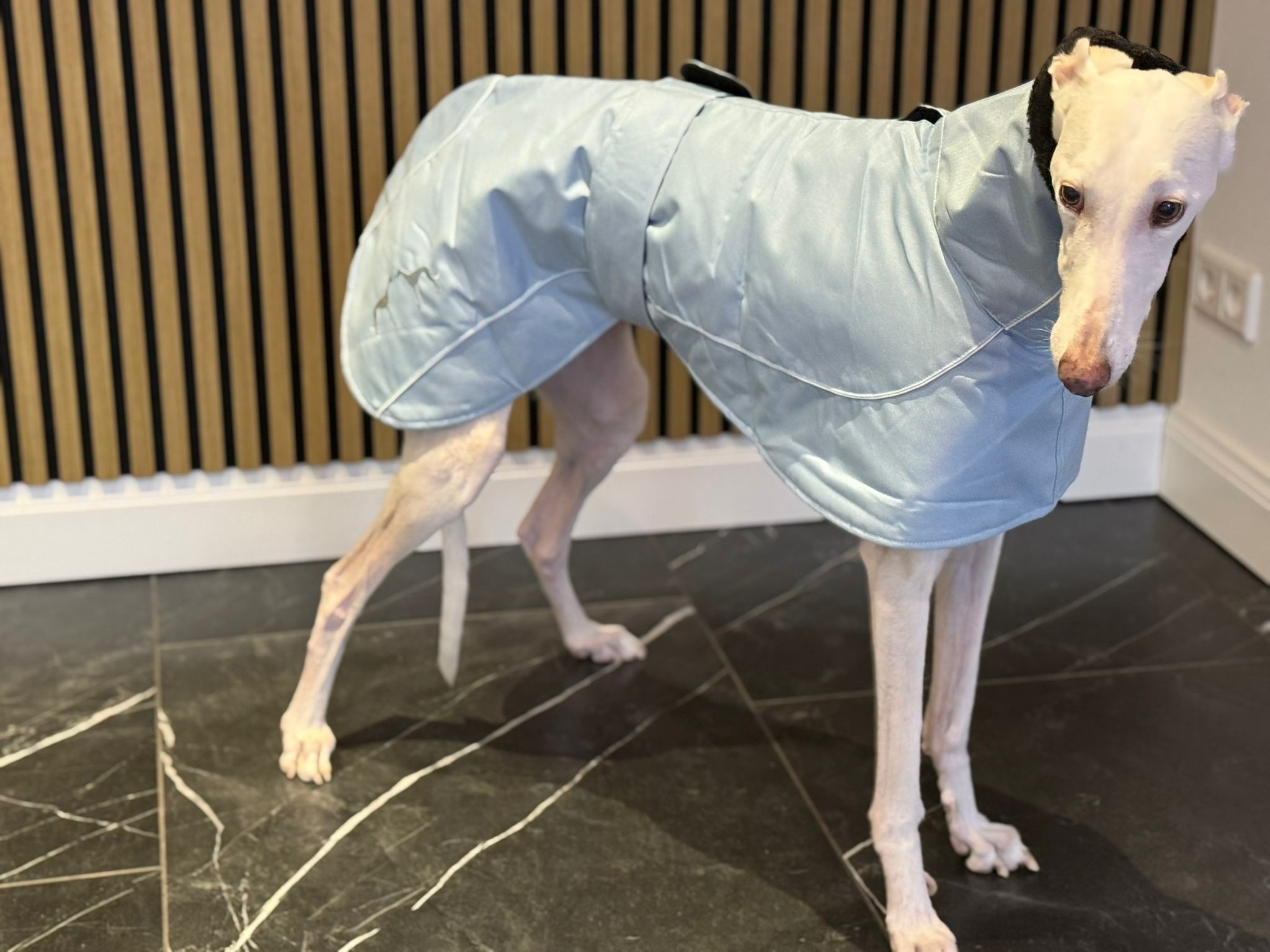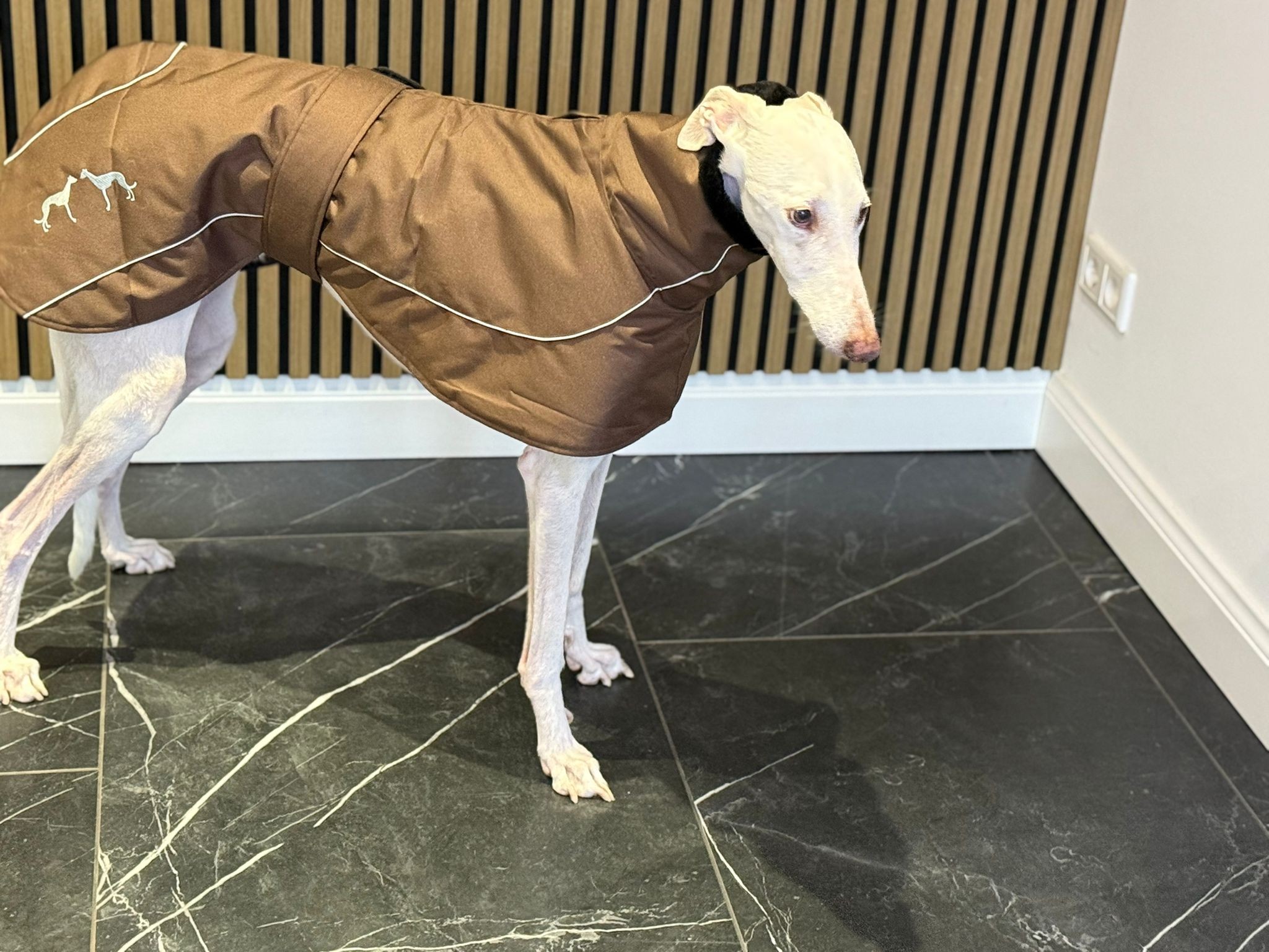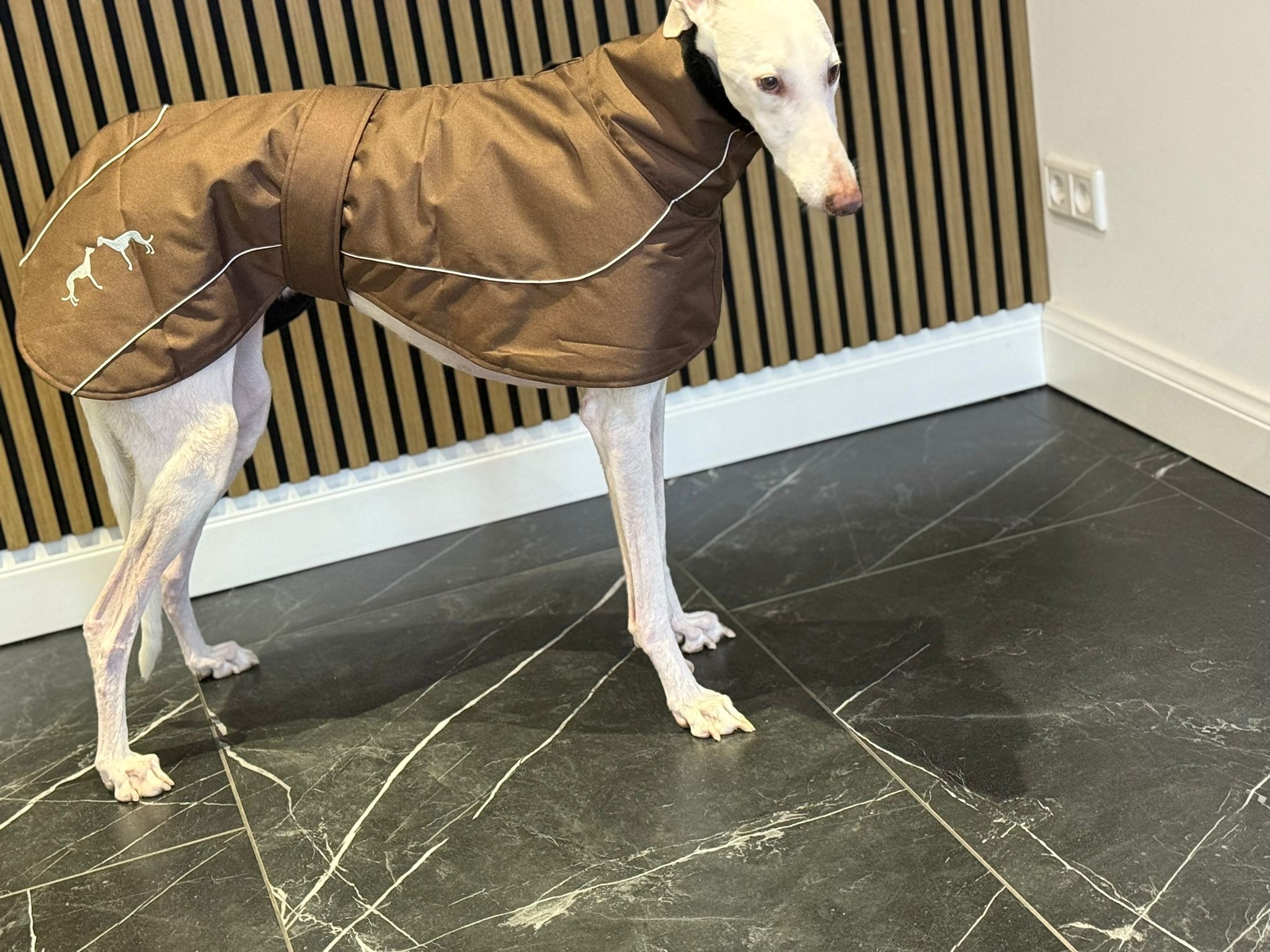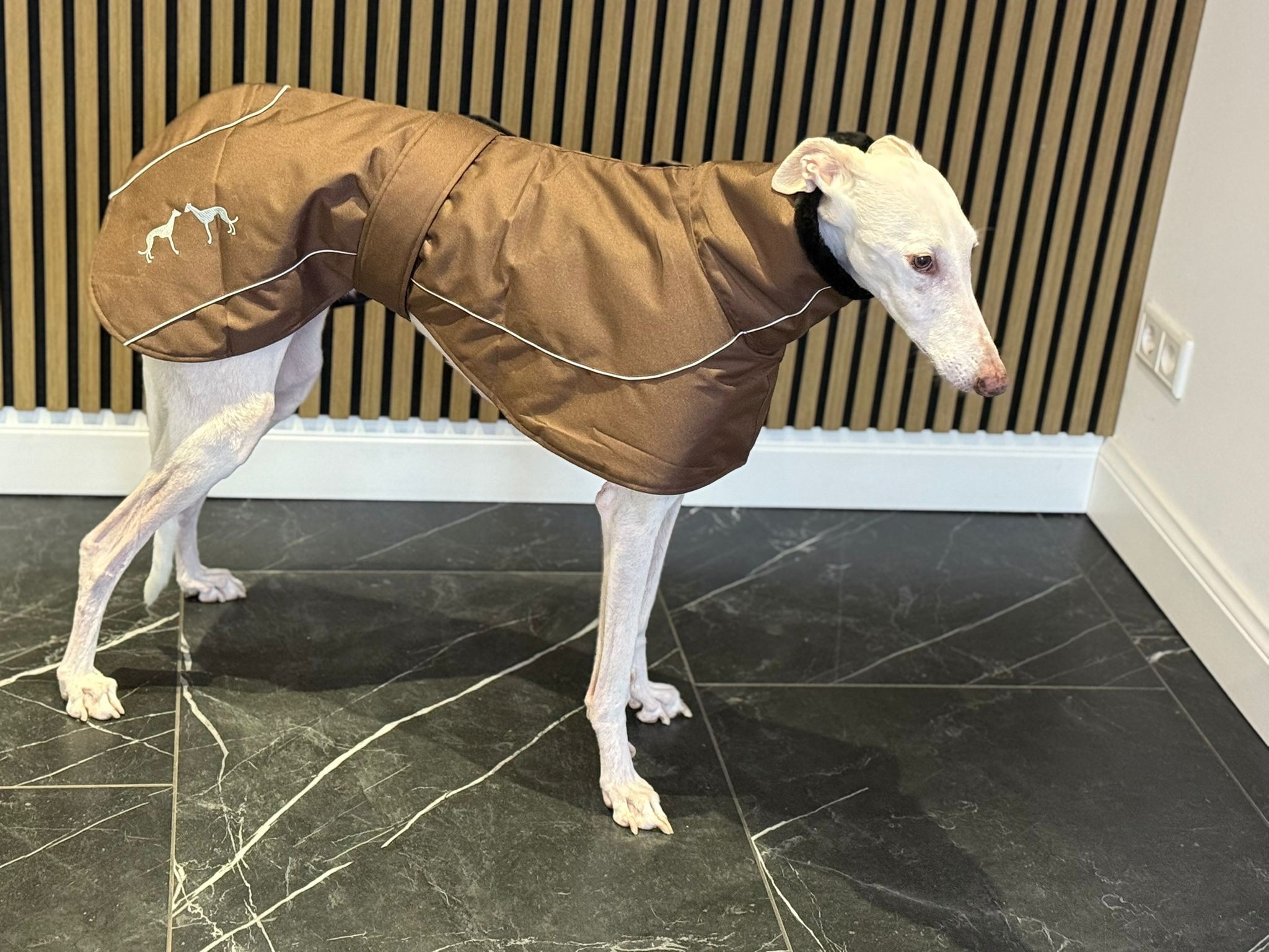 De jas is winddicht en lekker warm. De jas gaat over het hoofd aan en sluit met klittenband middels een band om de buik. Verkrijgbaar in de meest gangbare Galgo-maten.